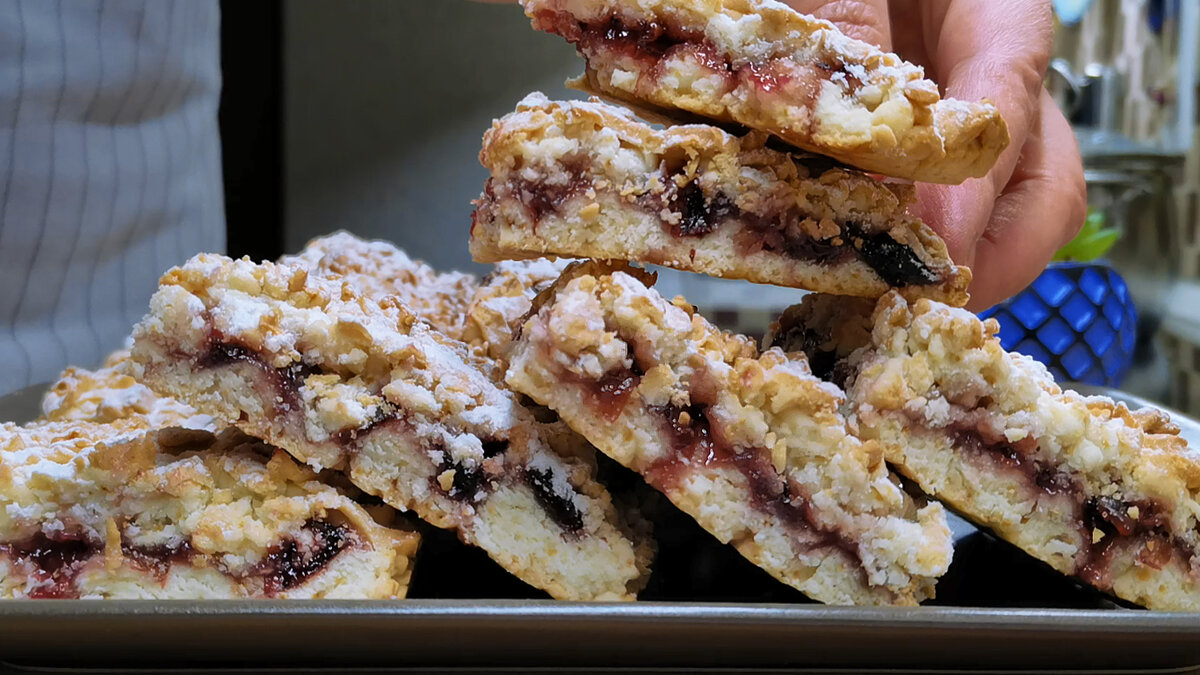 Этот рецепт сохранился у меня еще с советских времен, когда такая выпечка была любимой в каждом доме. И каждый раз, когда я ставлю ее на стол, она съедается быстрее торта. Знаменитый тертый пирог (или пирожные) с вареньем - очаровательная выпечка к чаю. Вариант с начинкой из черной смородины, самый классический и самый вкусный. Но точно так же можно приготовить его с любым вареньем или джемом. Все ингредиенты и их количество есть в конце статьи. Как приготовить: Готовим тесто. Оно предельно простое и состоит всего из нескольких элементарных действий. Насыпаем в миску муку и добавляем разрыхлитель. Ничего просеивать не нужно. Просто перемешиваем ложкой. Добавляем холодное сливочное масло, нарезанное кубиком. Перетираем смесь в крошку руками. Это очень быстро, занимает буквально полминуты. В отдельной посуде смешиваем яйцо (тоже холодное), сметану, обычный и ванильный сахар. Все перемешиваем и совсем слегка взбиваем венчиком до появления пузырьков. Вливаем жидкую смесь в сухую. Снова пер