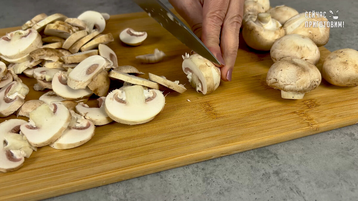 Шампиньоны нарезаем и выкладываем на сухую сковороду.