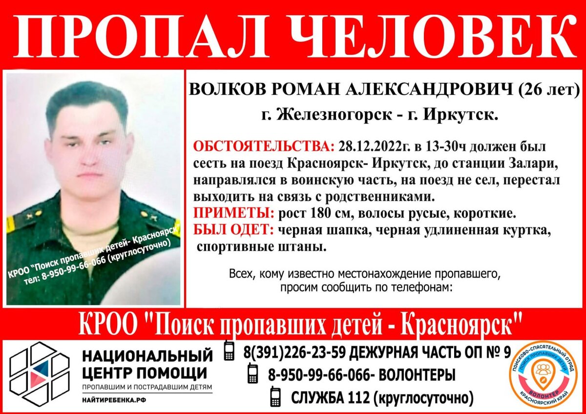 Роман Александрович Волков, 26 лет /Железногорск - Иркутск/ Перед новым годом, 28.12.2022г. в 13:30, должен был сесть на поезд Красноярск- Иркутск, до станции Залари, направлялся в воинскую часть, на поезд не сел, перестал выходить на связь с родственниками. ПРИМЕТЫ: рост 180 см, волосы русые, короткие. БЫЛ ОДЕТ: чёрная шапка, чёрная удлинённая куртка, спортивные штаны. Если будет информация о пропавшем, сообщить по контактам: 8/391/226-23-59 полиция ОП № 9, 112 телефон экстренных служб, 8-950-99-66-066 волонтёры (круглосуточно). #новости #чп #Ачинск #Красноярск #Железногорск #Новосибирск #Кемерово #Иркутск #Сибирь #Россия #объявление #пропалчеловек #розыск #поиск I i. Национальный центр помощи пропавшим и пострадавшим детям