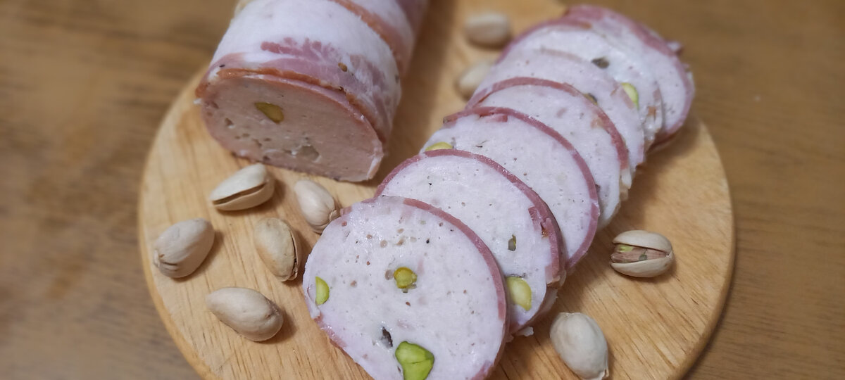 Отличная замена магазинным мясным нарезкам. Красивый, нежный, вкусный. Вмиг "улетает" со стола. Ингредиенты Филе куриной грудки 500 г Филе куриного бедра 500 г Фисташки 20-30 шт. Бекон с/к 2 упаковки 1 яйцо Сливки 50 мл(чем жирнее, тем лучше) Соль, специи, чеснок по вкусу( у меня черный перец и чеснок) Куриное мясо порезать Дважды пропустить через мясорубку Всыпать соль, специи, добавить яйцо, сливки, фисташки, перемешать Пищевую пленку расстелить на столе, на нее внахлест разложить бекон На бекон - фарш( сделать батончик) С помощью пленки свернуть в рулет Аккуратно снять пленку и переместить рулет на фольгу, запечатать и выпекать в духовке 40 мин.при 170° У меня получилось два рулета-большой и маленький. Можно разделить фарш пополам и сделать два одинаковых рулета. Очень вкусно!😋 и не сложно в приготовлении. Если понравился рецепт, ставьте👍,оставляйте комментарии и готовьте с удовольствием!