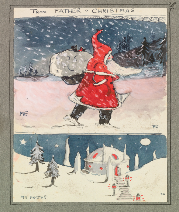 Старшие дети не всегда с восторгом принимают своих маленьких братиков и сестричек, но Джону Фрэнсису Толкину (старшему сыну писателя) было в тот период чем себя отвлечь и порадовать))) Он получил на Рождество письмо, с пунктом отправления: Северный полюс, за подписью Рождественского деда! Приложенная иллюстрация весьма убедительно показывала маленькому Джону, что письмо ему писал тот самый дед, который, вообще-то, привык их получать😁