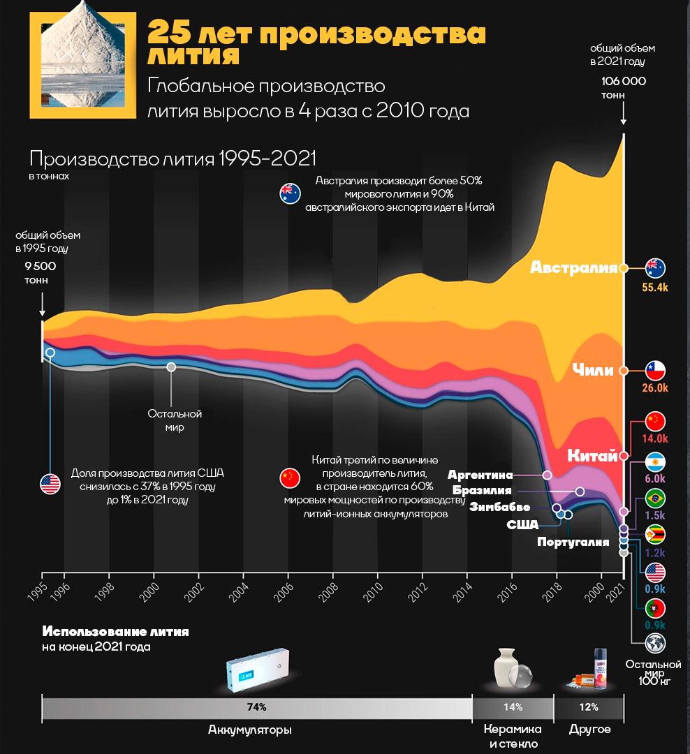 Мировое производство лития впервые превысило 100 000 тонн в 2021 году, увеличившись в четыре раза по сравнению с 2010 годом. Более того, примерно 90% его приходится всего на три страны.