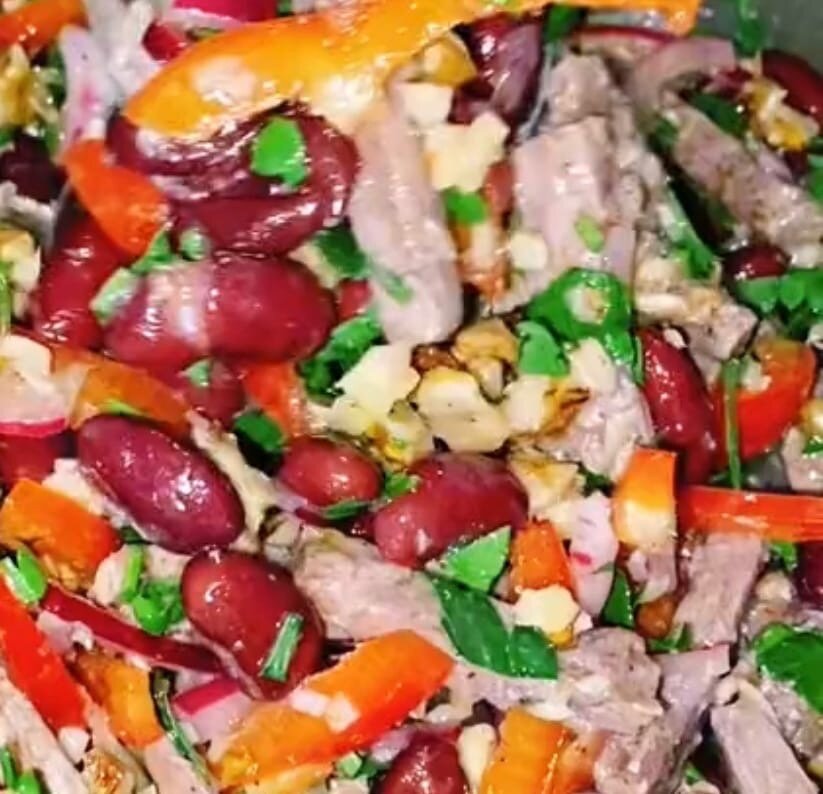 Новогодняя ночь прошла, но впереди еще достаточно праздников, для которых понадобится подходящий рецепт салата. После прошедшего ночного застолья стоит сделать выбор в пользу более легких вариантов, по сравнению с майонезными салатами, которые уже красовались на праздничном столе. К тому же такой рецепт салата идеально подойдет к любому мясному блюду, и даже придаст ему особый вкус, а так же добавит пикантности. А за счет большого объема, им можно угостить семью и гостей, ведь салат получается очень вкусным, быстрым в приготовлении, и, что не мало важно, легким и полезным. Ингредиенты · Лук · Говядина · Яблочный уксус · Консервированная фасоль · Болгарский перец · Чеснок · Хмели-сунели · Соль · Грецкие орехи · Петрушка · Растительное масло Готовим Для начала подготовим основные ингредиенты. Для этого нужно нарезать лук перьями и замариновать в яблочном уксусе. Отдельно отвариваем говядину до мягкости. Режем мясо на небольшие брусочки. Выкладываем говядину в глубокую миску, добавляем
