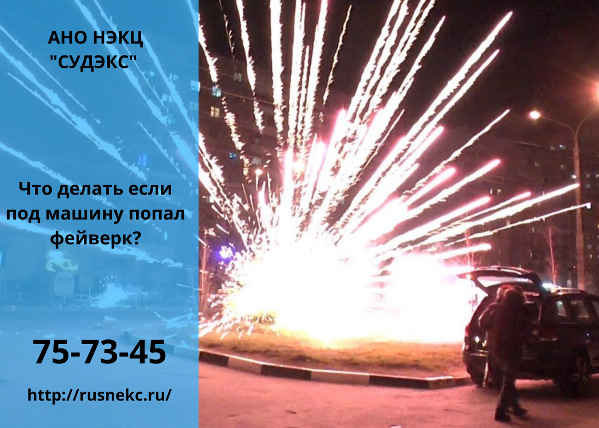Вопрос: Что делать если под машину попал фейверк? Ответ: Нужно вызывать сотрудников полиции и фиксировать факт причинения ущерба автомобилю. Именно полицию – ППС или участкового, если он будет работать в праздники. Также нужно собрать доказательства того, что ущерб причинил именно фейерверк, и найти, кто непосредственно причинил ущерб.