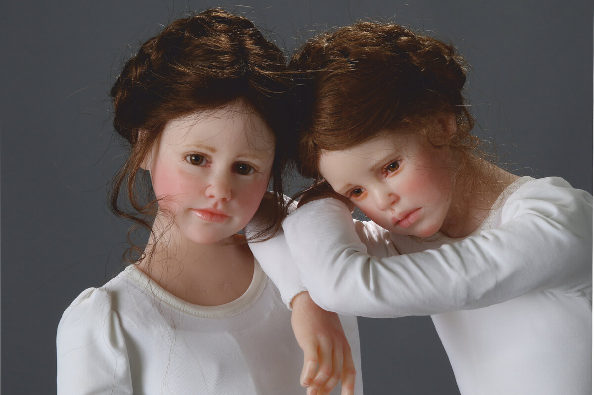 В задумчивости... Кукла ростом 60 см сидя, одета в красивое платье пыльно-розового цвета и болеро в тон. У нее светлые вьющиеся волосы и голубые глаза. Кресло расписано в стиле шэбби-шик, украшено подушечкой и розами. Зависть Куклы ростом 80 и 69 см. Бедная девочка одета в коричневое платьице, которое выглядит очень потрепано и заношено; она с завистью смотрит на младшую девочку, потому что та - богата и на ней надето дорогое шелковое платье, а волосы украшены цветами. Все равно его не брошу... Она ростом 54 см. Она сидит на старом стульчике, у нее морковно-рыжие человеческие волосы и хрустальные голубые глаза, она одета в розовый комбинезон и рубашку. В руках она держит игрушку кролика с оторванной лапой. Бабочки Эта кукла ростом 72 см, у нее морковно-рыжие волосы с кружевными бабочками на них, и голубые хрустальные глаза. На ней надето длинное белое платье, украшенное сзади букетом роз. БАЛЕТ Куклы ростом 78 и 76 см. На них надеты боди и юбки-пачки белого цвета, и лишь цве