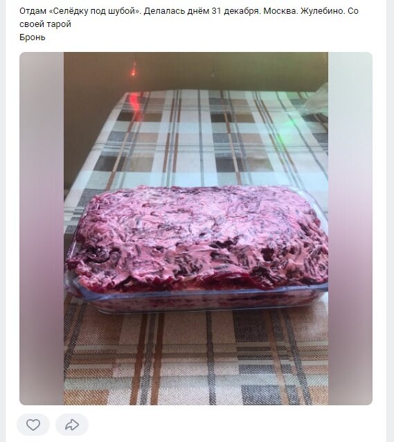 По традиции в России принято на Новый год готовить богатый стол. Но с 1 января очень многие сталкиваются с тем, что не в состоянии доесть огромное количество салатов, тортов, хлебулочных изделий и других пищевых излишеств. В помощь жителям организованы группы фудшеринга в соцсетях. В них люди бесплатно делятся едой. Тех, кто приезжает забирать угощения, здесь называют спасителями. «Четыре сумки готовой еды, много хлеба, пироги, овощи и фрукты. Также есть две подложки курицы, состояние не знаю. Сумки будут тяжелые, рассчитывайте свои силы. Забрать нужно все, что вынесу, без перебора», - пишет жительница Санкт-Петербурга Катя Ш. А Оксана Т. предлагает классический оливье. «Нужна помощь спасти оливье, свежее, сделала много. Майонезом не заправлен. Два вида колбасы: копченая и ветчина. Примерно 0.5 литра. СПб, пр. Дальневосточный», - обращается она к пользователям. Есть и «спасители», предлагающие свои услуги на популярных сайтах объявлений. К примеру, житель Санкт-Петербурга Андрей В. гот