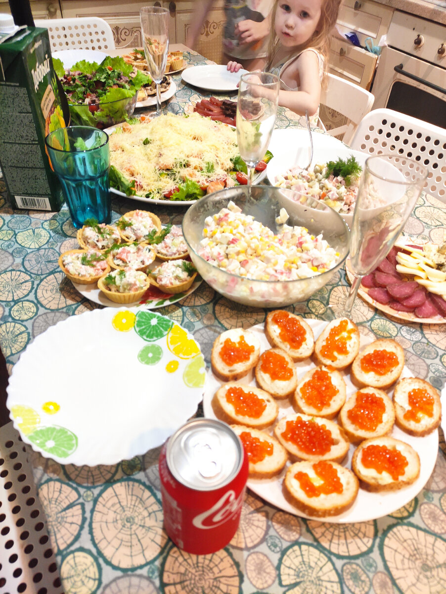 На этот праздник я готовлю побольше и повкуснее. Закуски: Бутерброды с красной икрой. Тарталетки с красной икрой. Начинка - сливочное масло и икра. Тарталетки не особо понравились. Бутеры всё же лучше. Тарталетки с красной рыбой. Вкусно. Красную рыбу мелко порезать, свежий огурец мелко порезать, смешать с творожным сыром и измельчённые укропом. Начинить тарталетки. Нарезка из вялено свинины и курицы. Суджук, сыры Чечил и с плесенью. Холодец. Салаты: Оливье. Крабовый( дети любят). Салат с креветками и авокадо. Очень вкусный, но вот на второй день уже никакой. Королевские креветки, обжарить в сливочном масле с чесноком На блюдо выложить салатный лист, или рукколу, креветки, авокадо, помидоры черри. Сбрызнуть лимоном, посолить и заправить оливковым маслом. Сверху натереть твёрдый сыр. Салат по грузински. Не зашёл. Хоть и вкусный. Но на НГ больше делать не буду. Отварная говядина, сладкий перец, красная, фасоль, грецкий орех, помидор, зёрна граната и кинза. Заправк