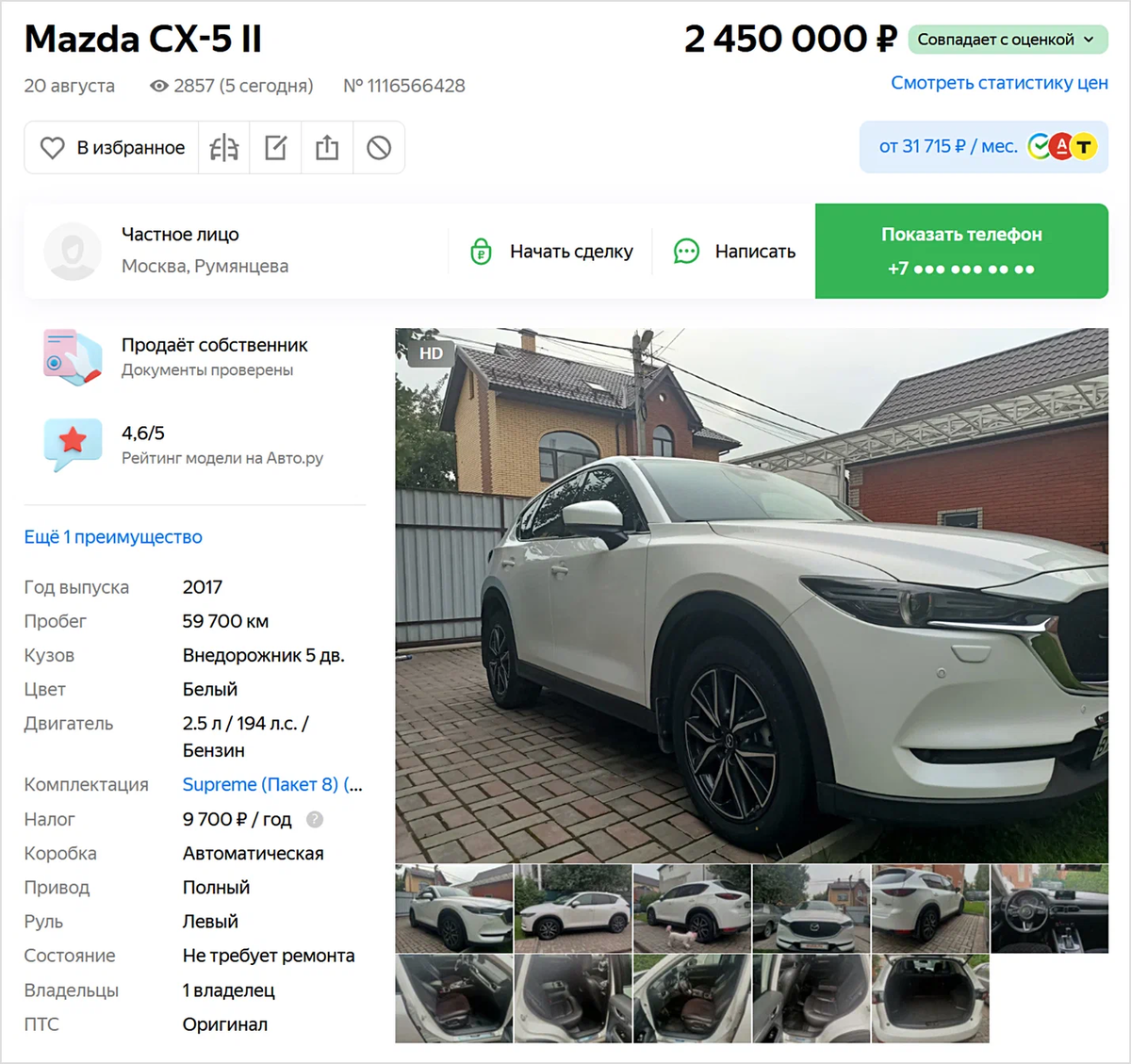 Похоже, что это понимают и потенциальные покупатели, которые посмотрели кроссовер вживую. Недаром его не могут продать так долго — ведь на Авто.ру представлены сотни СХ-5 II поколения с таким же мотором и полным приводом. Если их отсортировать по цене, белая Mazda оказывается только на третьей странице списка. Поэтому почему бы не поискать автомобиль получше? Пусть с парой царапин, зато с целыми лонжеронами.