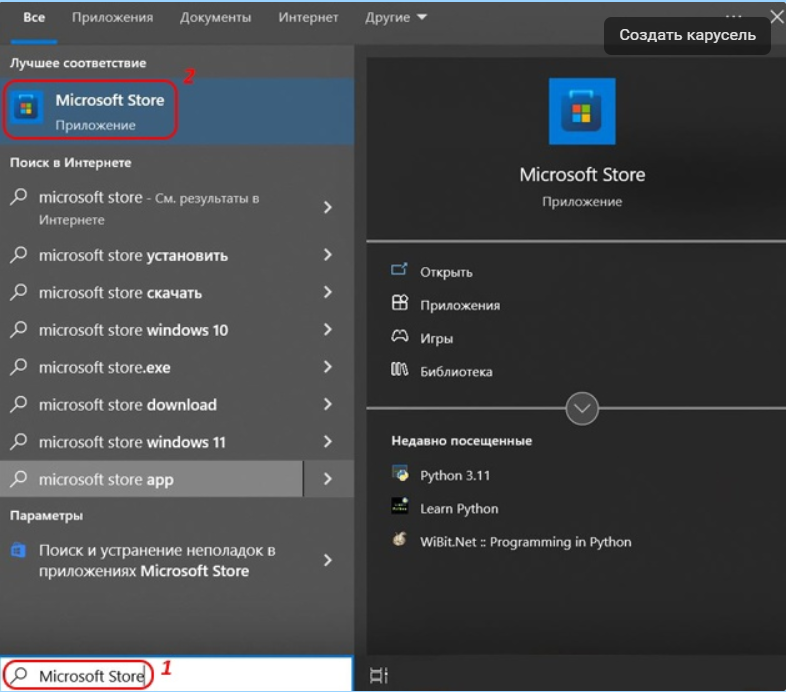 - Перейдите в меню Пуск (значок Windows в нижнем левом углу), введите "Microsoft Store" и щелкните ссылку, чтобы открыть магазин.