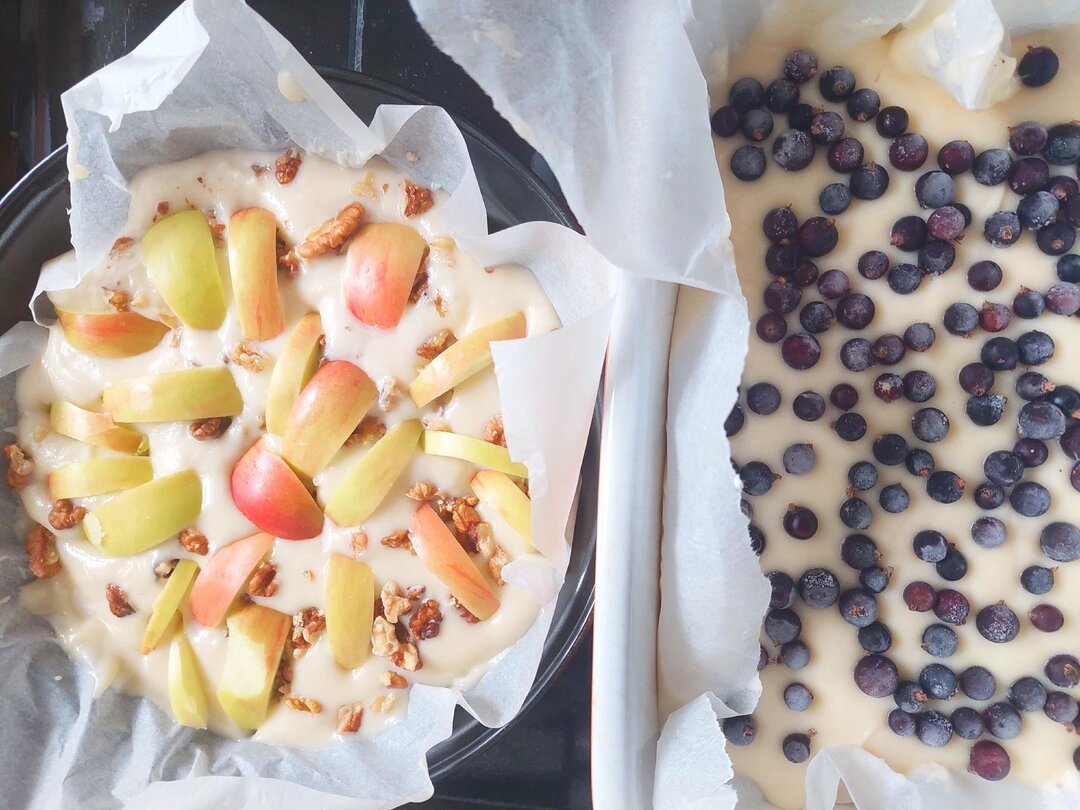 3. Застилаем формы для запекания пергаментом (у меня керамическая и стальная), и аккуратно перекладываем получившиеся тесто, сверху украшаем тонко нарезанным яблоком и орехами по кругу или ягодами смородины. Ставим в духовку на программу 180°( я ставлю в не разогрету