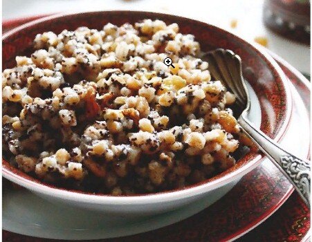 🐰 грецкие орехи – 50 гр. Приготовление Пшеницу сварить в рассыпчатую кашу (на 1/2 ст. крупы – 2 ст. воды). Мак растереть до получения макового молочка, добавить мёд и перемешать с пшеницей. В конце добавить толчёные орехи. Рецепт №2 Ингредиенты