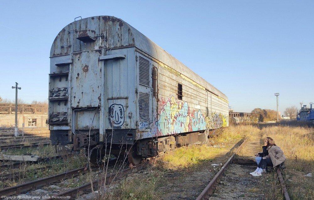 Я же говорил в прошлый раз, что на месте не остановился? Походя по пустынной станции Бойня, обнаружил на ней вот этот заброшенный живорыбный вагон (как следует из названия - предназначенный для перевозки живых рыб), и двух романтичных московских барышень, сидевших на рельсах, и любовавшихся этим вагоном:
