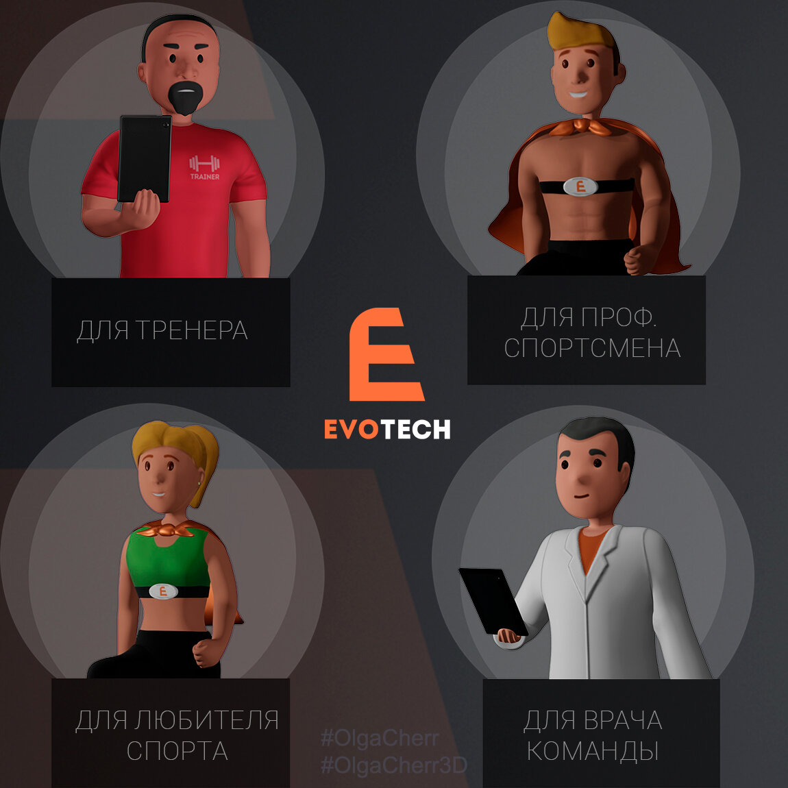 В конце 2022 года у меня появился заказ на создание четырёх 3D-моделей для рекламы мобильных приложений EVOTECH. Сейчас мои работы опубликованы на сайте evotech.life и используются в рекламных материалах и SMM. EVOTECH — линейка программных продуктов, которые создаёт команда учёных во главе с разработчиком и идейным вдохновителем Дмитрием Власкиным и профессором Андреем Похачевским. Недавно вышло первое приложение — EVOTEST. В него вышиты 2 функциональных теста на определение работоспособности спортсмена и его готовности к физической нагрузке. Продукт узкопрофильный, интересен тренерам, врачам спортивных команд и спортсменам как инструмент для быстрой диагностики организма перед тренировкой. Скачать приложение его можно на RuStore. EVOTECH — это часть большой экосистемы, в которую входит центр спортивной медицины APRESPORT. Поэтому в качестве пасхалки в рекламных макетах появляется спортивный врач. Он изменился минимально — стал держать в руках мобильное устройство с приложением и но