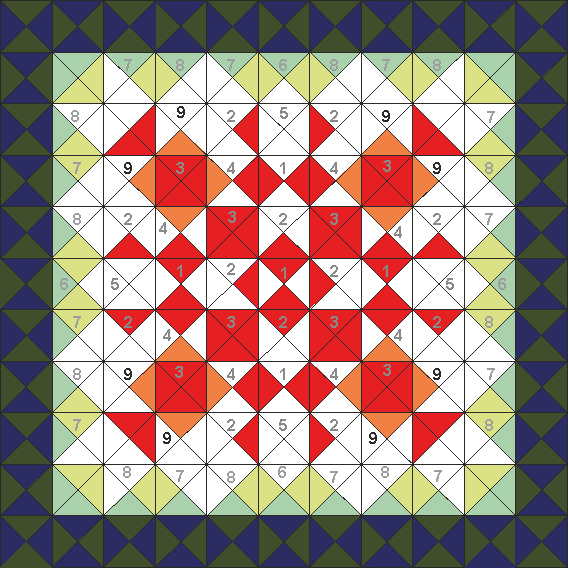 Новогодняя суета постепенно проходит и можно продолжить наш проект. Начало проекта: https://clck.ru/xjMF6. Осталось рассмотреть всего 4 блока. Сегодня займемся блоком №9. Таких блоков в одеяле 8 штук. Блок выглядит так: Для того, чтобы сшить один такой блок, понадобятся 4 разных белых квадрата и 1 оранжевый. У меня ассортимент накроеных белых квадратов уже заканчивается, поэтому я взяла два одинаковых белых квадрата по диагонали блока и один белый квадрат с рисунком.