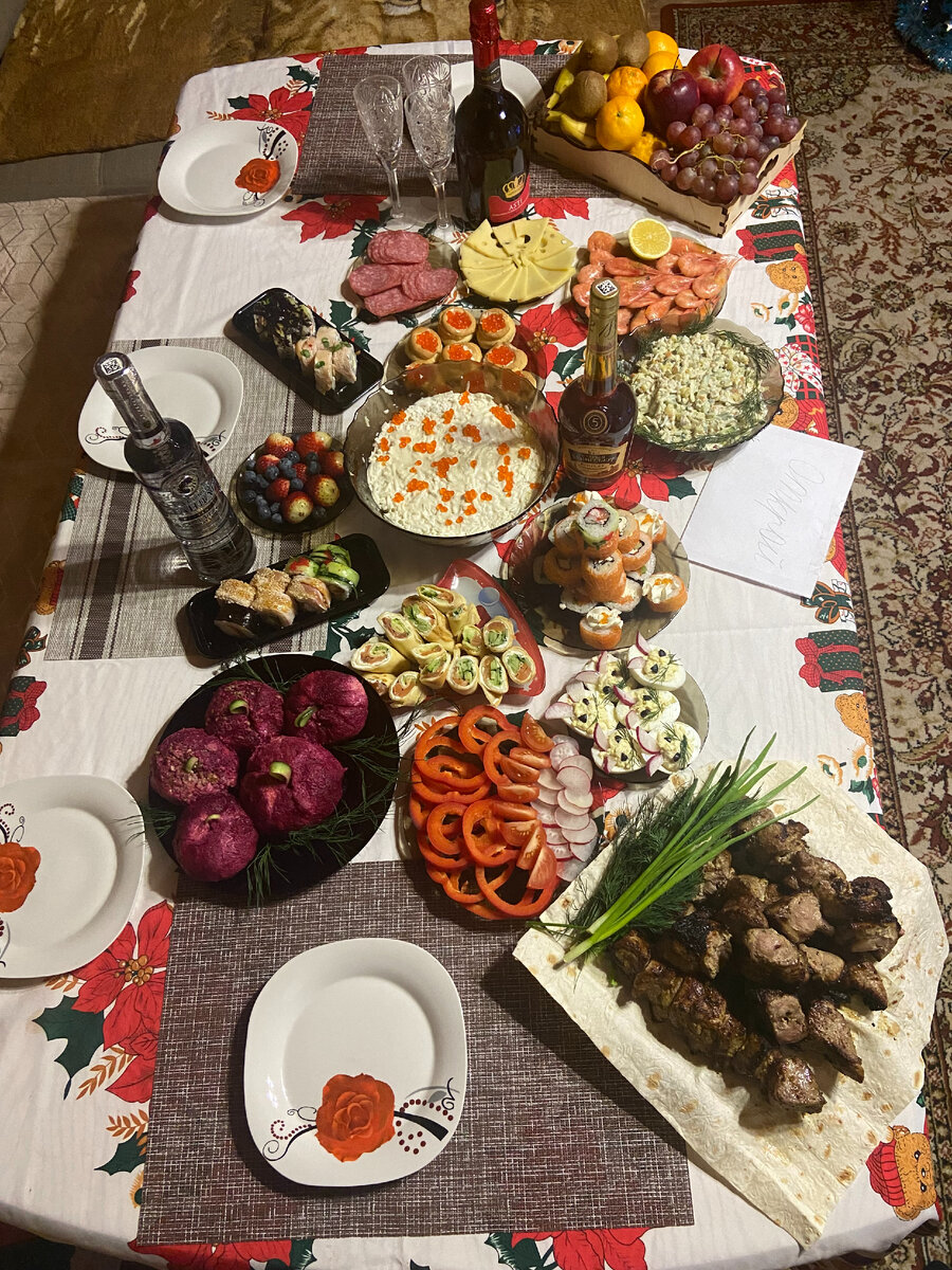 В этом году вся готовка легла на плечи моей мамочки, хоть ее и просили много не готовить. Я заказала роллы и купила красивый торт и шампанское. Хочу очень похвалить роллы. Раньше я побаивалась заказывать 31 декабря, вдруг много заказов, от этого пострадает качество или доставка сильно задержится. Заказывала за 3 дня, курьер приехал даже раньше, а роллы свежие, вкусные, красивые. Брала здесь. 1963 руб. за 36шт. Шампанское в этом году взяла новое Imperatore Asti, обычно покупала Gancia, но в этом году оно исчезло из магазинов, видимо санкции. Но замена ни чуть не хуже, по вкусу очень похоже на мое любимое. Брала в Перекрестке за 631 руб. Тортик купила в Елисее ( это местная сеть в Екатеринбурге). Торт молочная девочка, очень вкусный, почти как от домашних кондитеров. 700 руб за 650г. И по мелочи - мандарины, сыр, колбаска. В итоге на новогодний стол ушло 5000 руб. В прошлом году было больше.