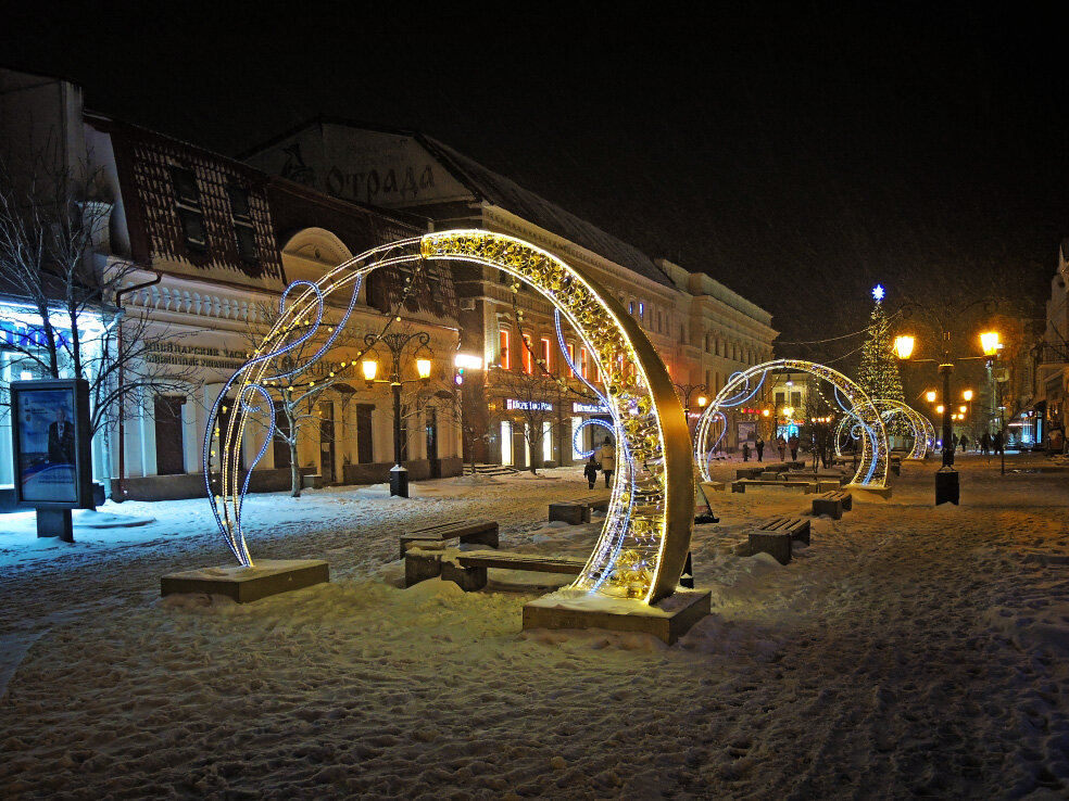 Ещё один фоторепортаж из новогодней Самары. В очередной подборке приглашаю прогуляться по пешеходной части улицы Ленинградской. Доехал сюда вечером 31 декабря. Погода была совсем не для прогулок - сыпал мокрый снег, который временами больше напоминал дождь. Поэтому снимал без особых подробностей. Да и не было в них нужды. Здесь мало что изменилось по сравнению с предыдущими сезонами. Ниже можно посмотреть подборки дневных и вечерних фотографий 2021 года. В этом году пропали два объекта. Нет домика и часов. Вместо домика приехала ёлка от Третьяковки. В прошлом году она стояла около здания фабрики-кухни. Участок между улицами Фрунзе и Куйбышева. Ёлка стоит со стороны улицы Куйбышева. На мой взгляд, здесь она смотрится удачнее. Участок между улицами Фрунзе и Чапаевской. Здесь натягивают сетку «звёздное небо». Уже много-много лет. На месте фонтана примерно посередине раньше и стояли пропавшие часы. На их месте в этот раз нет ничего. Ёлка на пересечении с улицей Чапаевской. Тоже постоянно н