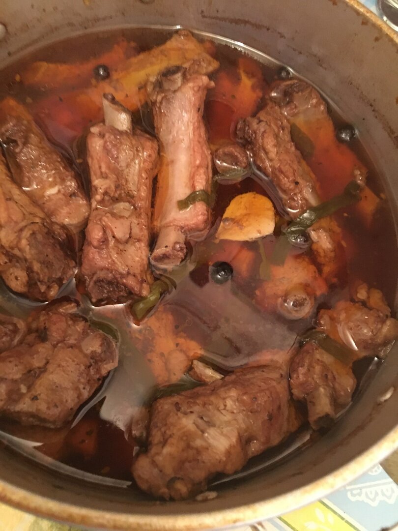 Продолжаю радовать пузики своих домочадцев. Новый год и новое блюдо «Пьяные рёбрышки» Держите ваши пальчики, иначе оближете до локтей. Ловите рецепт Ингредиенты (все расчитываю от 1 кг): * Свиные ребрышки - 1 кг * Чеснок - 3-4 зубчика * Имбирь - 30-50 г * Зеленый лук - 4-6 шт (лука много не бывает) * Перец чили - по вкусу (кто любит по острее) * Соевый соус - 75-90 мл * Сахар - 2 ст. ложки * Вино белое сухое- 50 мл (можно и без вина) * Пиво темное - 500 мл (а вот без пива нельзя) * Растительное масло (на глаз, только не на свой) * Перец черный (без него нельзя) Способ приготовление (можно делать по своему): Для начала затопите печь. Если у вас ее нет, ууппссс, для вас рецепт закончен - ШУТКА. Свиные ребрышки разделяем друг от друга, так чтобы у вас были ребрышки по одному. Сбрызгиваем растительным маслом и обжариваем на сковороде до золотистой корочки, не принципиально конечно, но будет вкуснее. Добавляем чеснок и тонко нарезанные ломтики имбиря, в процессе жарки. Туда же в сково