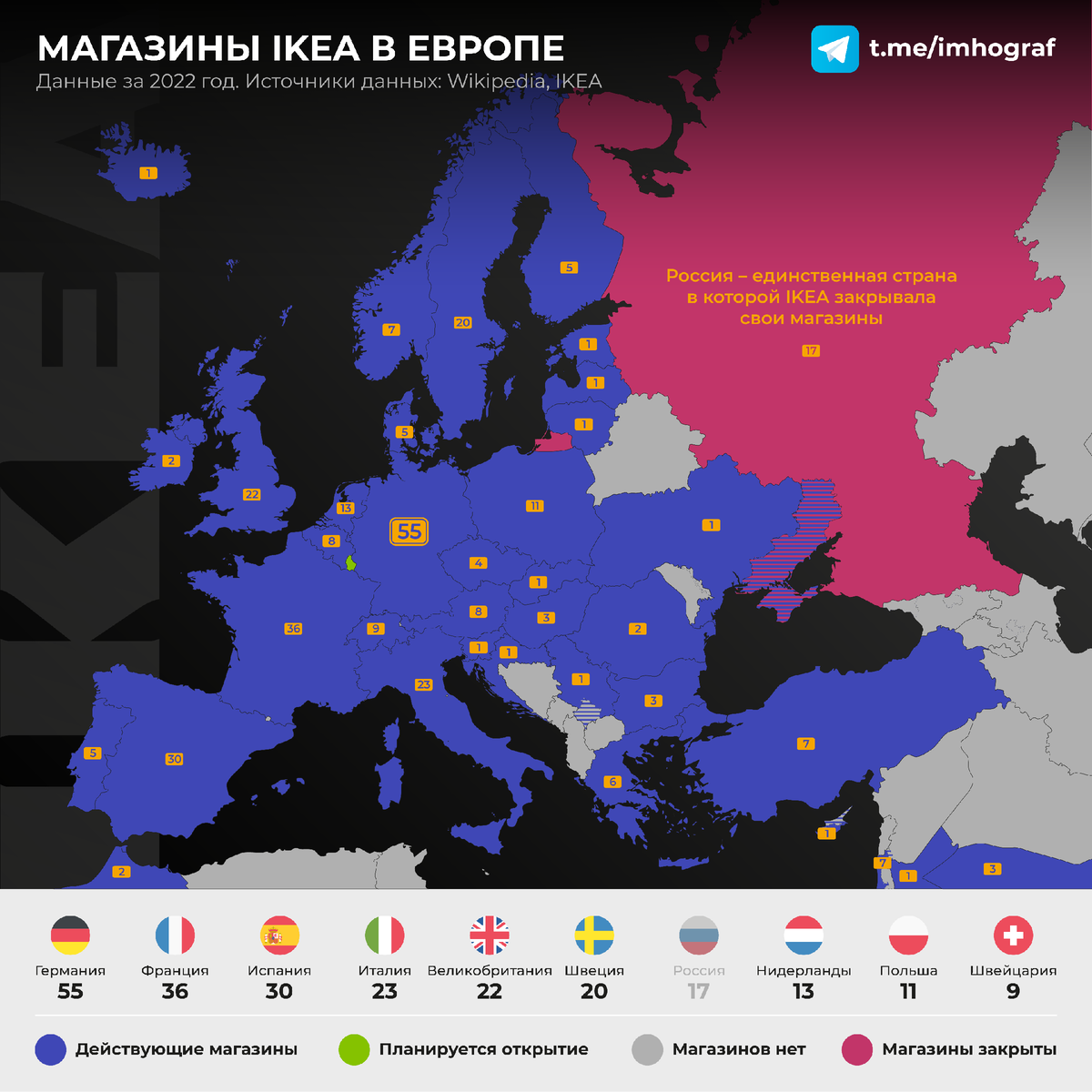 По общему числу магазинов в Европе с большим отрывом лидирует Германия — 55 магазинов. Во Франции и Испании — 36 и 30 магазинов соответственно. В Италии 23 — это четвертое место, а замыкает пятёрку Великобритания с 22 магазинами. До недавнего времени в десятку лидеров входила и Россия, но после 24 февраля IKEA приняла решение закрыть все магазины и полностью ушла из страны, при этом оставив здесь работающее производство, а также торговые центры MEGA. Россия — единственная страна на сегодняшний день, в которой IKEA закрывала магазины.