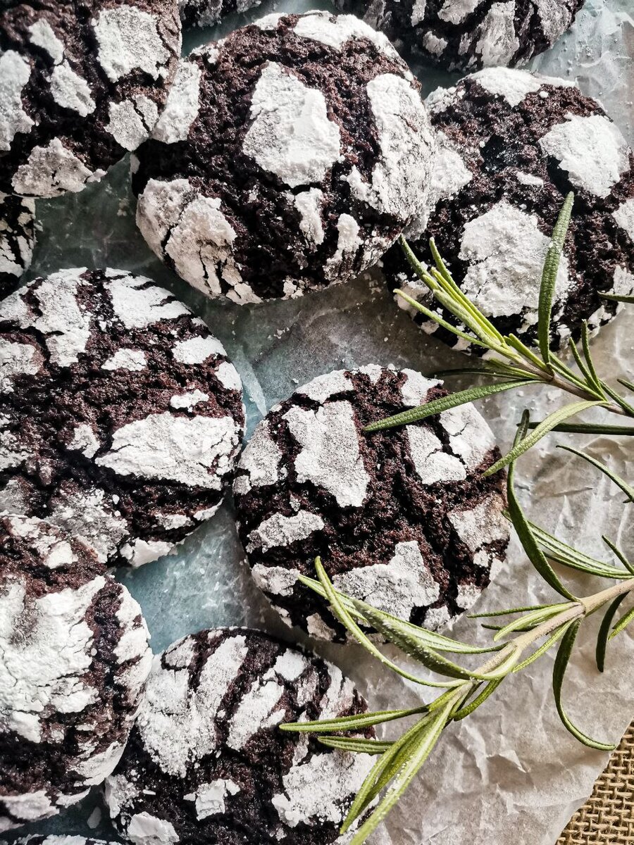 В моей копилке легких десертов пополнение -- печенье с трещинками. Готовится из простых и доступных ингредиентов, а сам процесс не требует серьезных усилий. Ингредиенты: #сахар -- 350 г #масло растительное -- 110 г #какао -- 120 г #яйца -- 4 шт #мука -- 240 г #разрыхлитель -- 2 ч.л #соль -- 3/4 ч.л ванильный экстракт -- 2 ч.л (у меня его нет) сахарная пудра -- 50-100 г Приступим! Соединить муку, разрыхлитель, соль и отложить. Выложить в миску сахар и растительное масло. Соединить миксером. Добавить какао и на низкой скорости соединить. Добавить яйца по одному. Добавить мучную смесь и соединить. Если у вас миксер мощный, работайте им. Если простенький, как у меня, мучную смесь вмешайте лопаткой, не рискуйте техникой. Накрыть тесто пленкой в контакт и отправить в холодильник на несколько часов. Я готовлю тесто вечером, а выпекаю печеньки утром. Можно и сутки продержать. Разогреть духовку до 180 градусов. Ложкой отмерить небольшое количество теста, скатать шарик, обвалять его в сахарной п