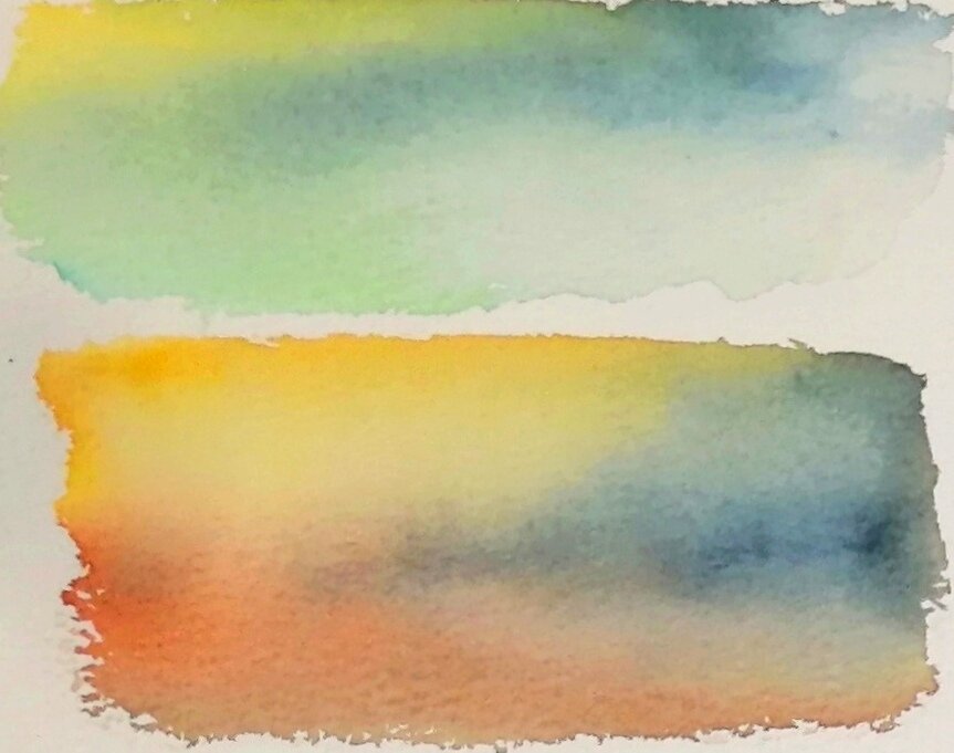 Самая красота в акварели - заливка с плавным переходом между цветами. Именно она придаёт акварельными работам нежность, звонкость и легкость. Градиентная заливка создаёт неповторимое ощущение естественного и незаметного перетекания одного цвета в другой. Выполняется обычно по-сырому, чтобы акварель могла раскрыть свой потенциал текучести в полном объёме. Умение делать ровные заливки и растяжки цвета очень ценится в акварельной технике. Градиент используется для первых заливок при написании неба или воды, где важна воздушность и прозрачность красочного слоя. Обычно выполняется с использованием двух - трех цветов.