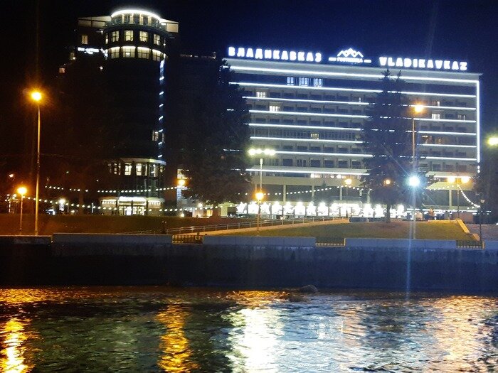 В продолжение первого поста Записки сибирского путешественника. Владикавказ, часть 1... расскажу и покажу кусочек вечернего Владикавказа. Мой прогулочный маршрут состоялся 18 ноября теперь уже прошлого года и пролегал по проспекту Мира и ближайшим к нему набережным Терека с обеих сторон реки. Итак, погнали! Проспект Мира представляет собой довольно широкую улицу, особенность которой в том, что посередине ее находится пешеходный бульвар со скамейками и фонарями, местами с деревьями, местами выходящий на открытое место, а слева и справа от бульвара - действующая трамвайная линия! И это привносит улице какой-то особый шарм. К этому можно добавить музыку из динамиков, которая сопровождает тебя на всем пути. Причём очень хорошая музыка, песни о доме, о мире, о людях... С проспекта я спустился к Тереку. Было очень тихо и малолюдно. Я прошел мимо отеля, мимо пешеходного моста до следующего моста, улицы героя осетинского народа генерала Иссы Плиева, там же ему установлен памятник. Шел мимо пру