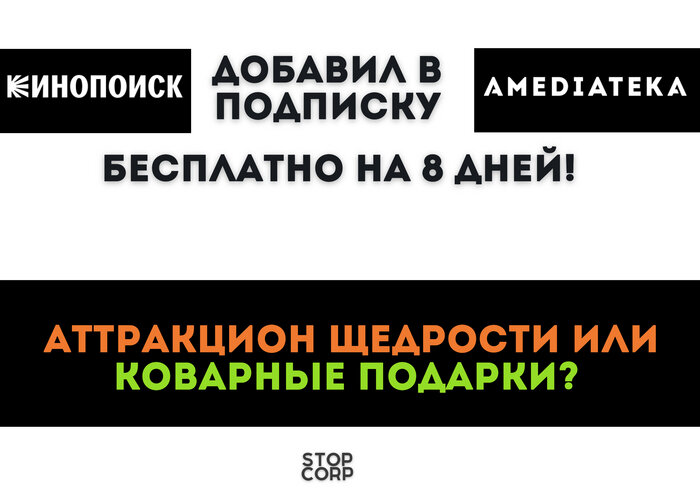 1. Вроде бы бесплатно (но мы уже зашуганы такой щедростью и не особо поверили) Дано. Пользователь с подпиской Яндекс Плюс Мульти (без Амедиатеки). 31 декабря многим таким на почту пришел спам подарок от Яндекса Кинопоиска. Большими буквами сообщалось, что "Амедиатека в вашей подписке на все каникулы. Уютная акция для вас — доступ к фильмам и сериалам Амедиатеки до 8 января включительно. Приятного просмотра ✨. Учитывая то обстоятельство, что сегодня компании научились снимать деньги даже за движение мышкой и просмотр рекламы в приложении банка, было полезно узнать, какой подвох приготовили нам продажники компании, которая перед российской налоговой отчиталась об убытке в 4, 85 млрд рублей за 2021 год (при выручке 7 млрд с копейками). При этом выручка «Амедиатеки» за 2021 год составила 3, 4 млрд рублей, а чистая прибыль 731 млн рублей. Пока вы нарезаете оливье, заливаете рыбу и охлаждаете шампунь, нам приспичило глянуть, что там приписали мелким шрифтом. 2. Пояснения есть, но яснее не ст