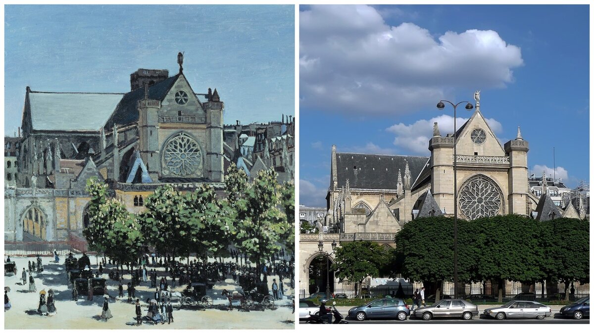 Гениальный французский импрессионист писал лишь то, что видел своими глазами. Лишь настоящая природа, люди, места и сцены. Современники не сразу оценили его идеи запечатлевать реальность, не сразу поняли его талант. Но сейчас картины Моне стоят бешеных денег и приносят зрителям колоссальное удовольствие! А мы открыли для себя ещё одно удовольствие - находить реальные виды тех мест, которые изображал художник. Приглашаем и вас в это маленькое путешествие по следам Клода Моне! 1. Сен-Жермен-л’Осеруа, красивая средневековая церковь в центре Парижа. Моне написал эту картину в 1867 году, вскоре после того, как к нему пришла известность после знаменитого портрета Камиллы "Дама в зеленом платье". 2. Скалы в Этрета - это живописное местечко на побережье Ла-Манша. Городок Этрета так и манил к себе художников, и Моне тоже не мог удержаться. Он приезжал сюда несколько раз: впервые - с Камиллой и маленьким сыном, а потом, 15 лет спустя - в одиночестве, терзаемый мыслями о своей будущей второй жене