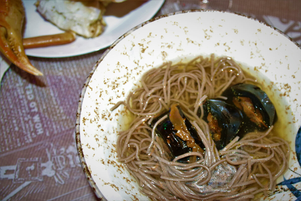 У нас с Таро (а мы отмечали праздник вдвоем) на новогоднем столе в этот раз было: обязательно - соба, крабы из России (в магазинах Фукуоки сейчас продается много разных видов крабов и рыбы из нашей страны), моя любимая "кадзуноко" - японская икра сельди и нежно любимая Таро - говядина-вагю.