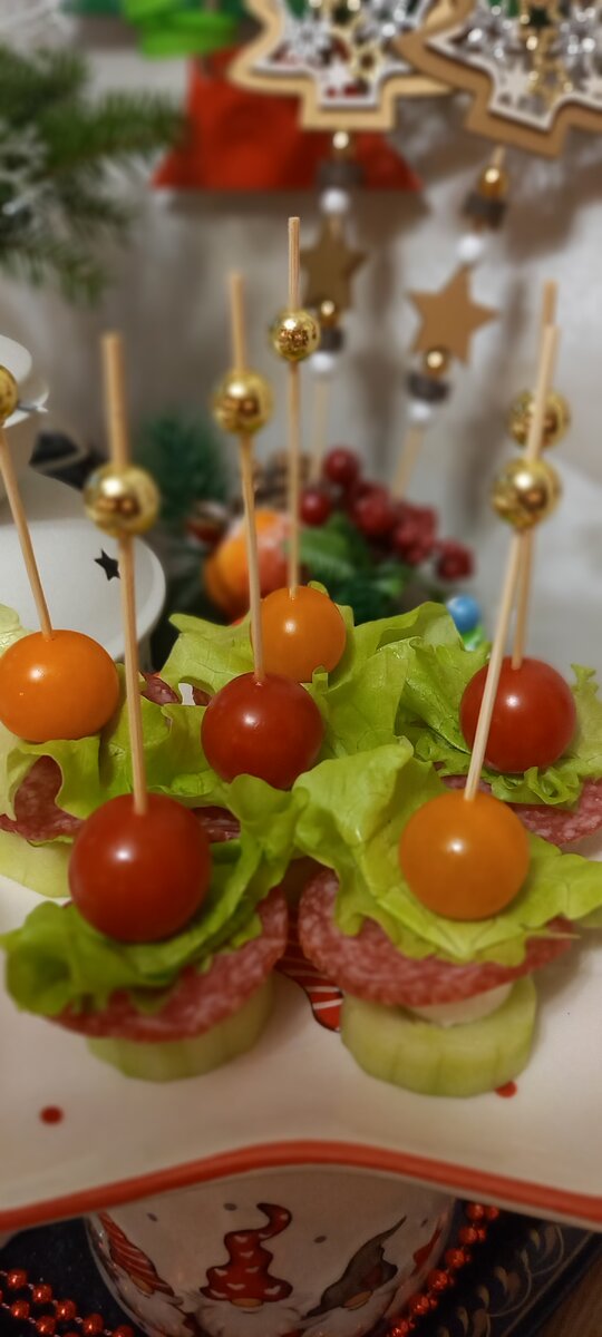 Легкая, яркая, оригинальная закуска на праздничный стол Ингредиенты Огурец нарезаем толстенькими кружочками На шпажку насаживаем сначала черри, потом салат Далее берем половину моцареллы(можно и целую, как захотите) и заворачиваем ее в кусочек колбасы Соединяем с салатом и черри И последним насаживаем огурец Получились вот такие башенки Нюансы: кусочек колбасы в процессе разворачивается. Так что можно его насаживать не сворачивая, либо брать нарезку сервелата большего диаметра. Весёлые канапе готовы. Думаю, они подойдут под любой напиток. Оставляйте свои комментарии, ставьте 👍- это продвинет мой канал, и вы увидите много интересных рецептов.
