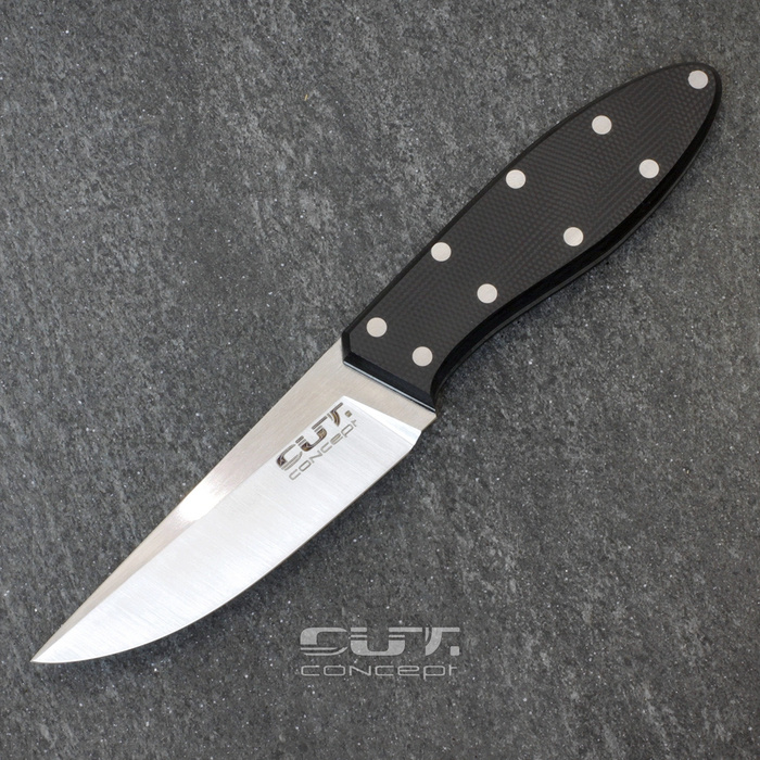Накладки рукояти изготовлены из стеклотекстолита G10 крепеж на штифтах из нержавейки. Рукоять плоская с фасочками под 50 градусов.