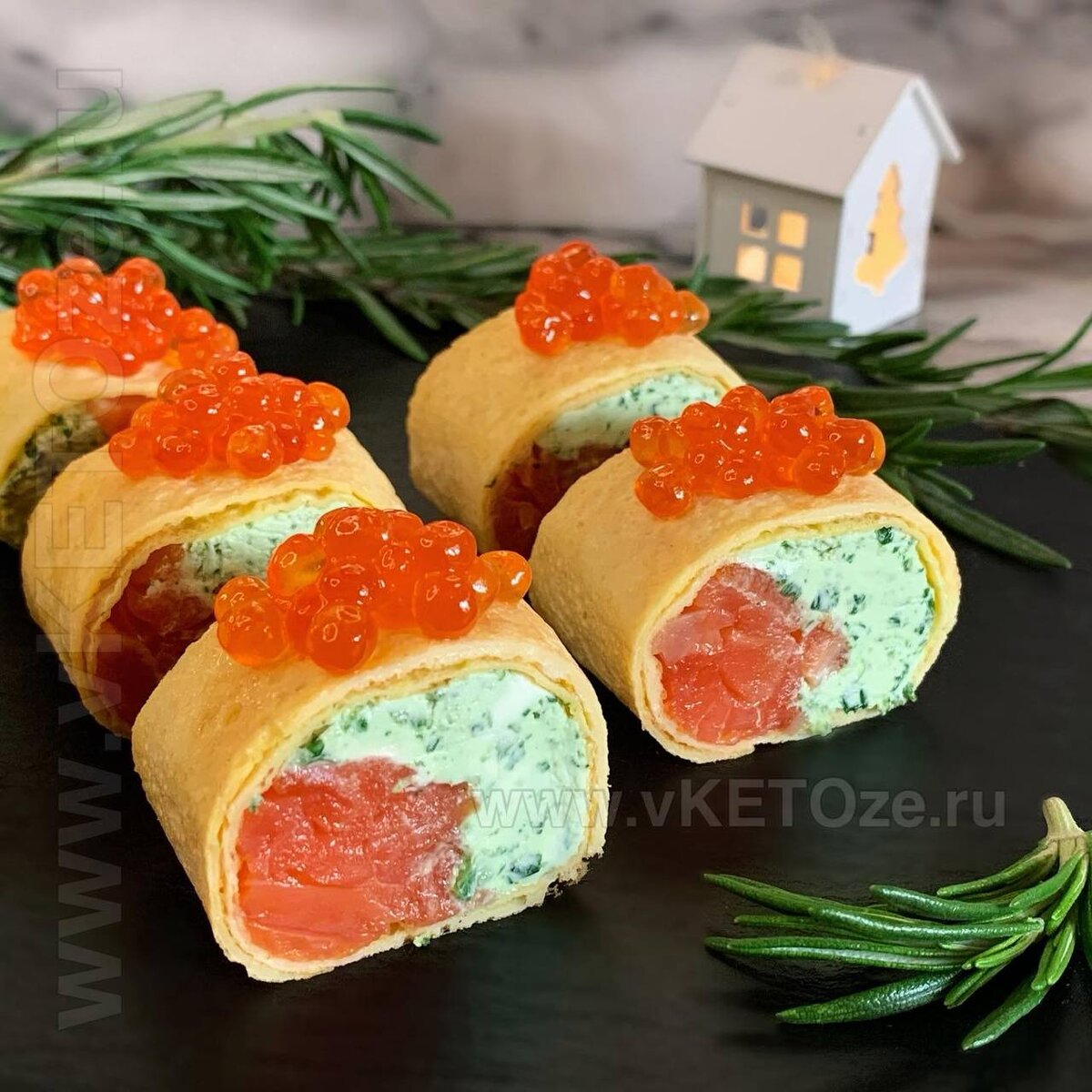 ✔️Наносим начинку на яичный блинчик (рыба + сыр и шпинат) и сворачиваем в ролл.