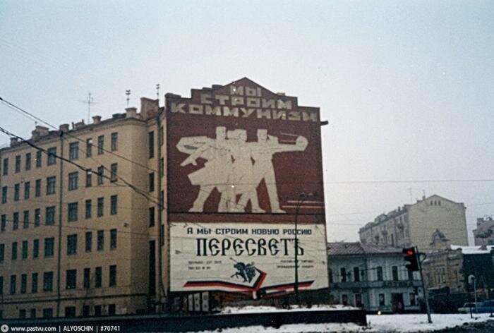 Стремительные годы переворота и полного изменения в самосознании страны, отошедшей от былого социалистического уклада и примеряющей новые одежки капиталистической жизни. Фотографии Москвы «лихих» 90-х годов, москвичи адаптируются к новой жизни, кто-то привыкает к новому укладу, кто-то пользуется новыми возможностями, чтобы заработать. Москва в фотографиях 90-х это город раннего и быстрого капитализма. Яркие рекламные стенды, автобусные остановки, обклеенные объявлениями, бесчисленное множество ларьков, выстроенных вдоль улиц, иномарки на улицах и меняющаяся каждый год мода. (Дом № 60/2 по улице Большая Полянка, фасад с выходом на Садовое кольцо многие годы украшала надпись "Мы строим коммунизм", в 90-е годы "приукрашенная" характерной для настроения того времени рекламой ниже) (Наверное, самый успешный день в истории компании МакДональдс 31 января 1990 года, когда в первый день открытия в Москве, ресторан обслужил 30 000 посетителей. Огромная очередь стояла с раннего утра до самого за