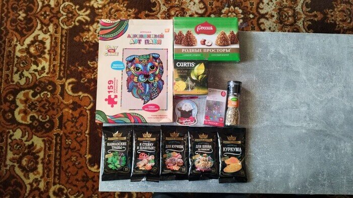Итак, мне пришла моя посылочка от Тайного Санты (точнее, от Тайной Снегурочки в моём случае). Сообщение пришло утром как раз перед запланированным походом с женой. Не терпелось скорее получить свой подарочек, но решили, что таки сходим в поход, а потом сразу на почту. Поход получился недолгий, и вот мы уже на почте! Штрих-код, фамилия, "Скажите номер из СМС", и заветный пакет у меня в руках. Бегом домой! Что же внутри? Первым делом вытащил самое габаритное - деревянные паззлы. Начало хорошее, но самое приятное ждало дальше - приправы! Для курицы, для плова, куркума, к стейку и шашлыку, кавказские травы, для рыбки - отлично! К этому прилагалось "чайное дополнение": коробка "Родных просторов" (тут жена закричала: "Мои любимые! "), чай с манго. Для антуража, не иначе, в посылочку добавили магнитик и LED гирлянду - спасибо! Но гвоздём номера стали фартук и прихватка. Теперь есть всё для продолжения вкусных новогодних каникул! Спасибо! Всех с Наступившим! ПС: проверено котоинспекцией. Комме