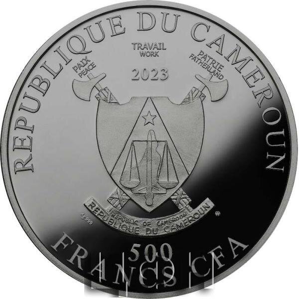 Номинальная стоимость монеты – 500 франков КФА, драгоценный металл – серебро (999), покрытие рутением, «Proof», селективное окрашивание, вставка Swarovski, диаметр – 32 мм, вес – 14.14 г, тираж - 999 шт. На аверсе монет в центре изображен герб Республики Камерун. Вдоль канта расположена легенда: «500 FRANCS CFA», «REPUBLIQUE DU CAMEROUN», год выпуска монеты - «2023». Справа от герба расположен знак монетного двора Польши, слева - технические характеристики металла «Ag 999»