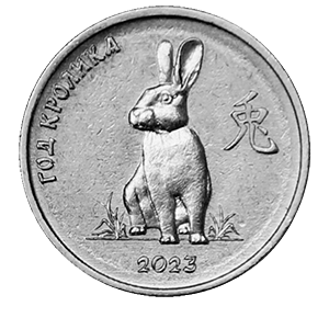 Монетный двор Приднестровский республиканский банк Диаметр, мм Ø22 мм Вес, гр4.75 гр. МатериалСталь с никелевым покрытием ГуртГладкий Тираж, шт35 000 шт. Аверс: в центре – изображение Государственного герба Приднестровской Молдавской Республики; по кругу – надписи: вверху– «ПРИДНЕСТРОВСКИЙ РЕСПУБЛИКАНСКИЙ БАНК», внизу – год «2021»; в нижней части под гербом – номинал «1 РУБЛЬ». Реверс: в центре – стилизованное изображение кролика, справа – китайский иероглиф, обозначающий символ года; слева – надпись: «ГОД КРОЛИКА», внизу – надпись: «2023».