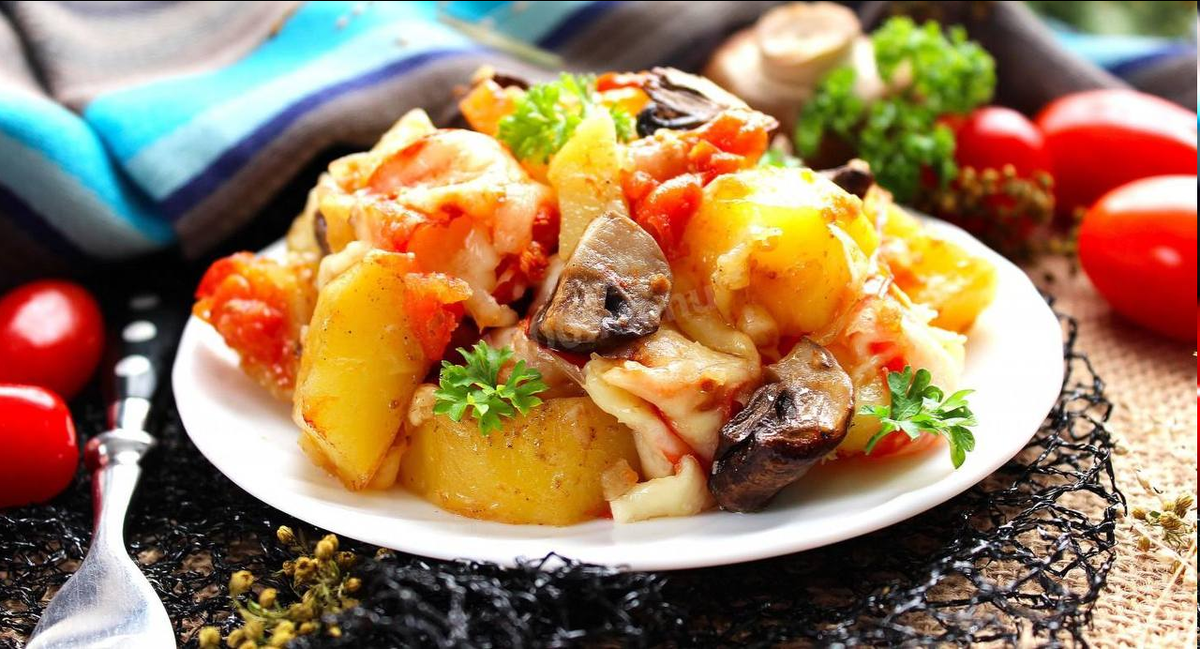 5. Как только овощи дадут сок, переложить их к картофелю и поставить запекаться на 20 минут в духовку.