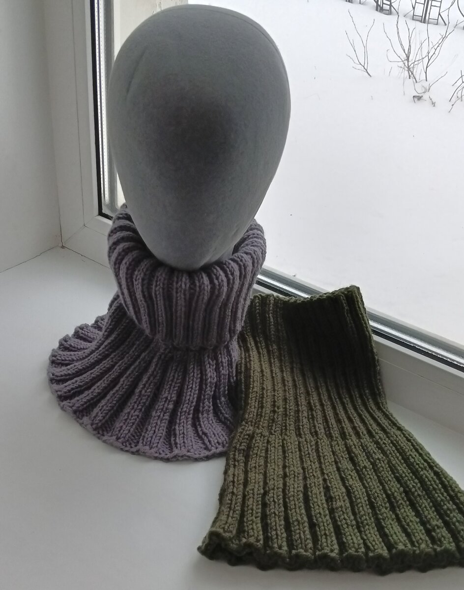 Манишка-снуд вяжется очень легко. Набрать100 петель и вязать резинкой2/2 20см, затем прибавить в лицевой дорожке 1 петлю из протяжки между петлями, связать ещё 14 рядов, прибавить ещё по 1 петле в изнаночной дорожке и вязать до 18 см общей длины. У меня расход пряжи 100 гр пряжи Ланаголд классик. Начинаю вязать спицами 3мм, после прибавки перехожу на 4мм.