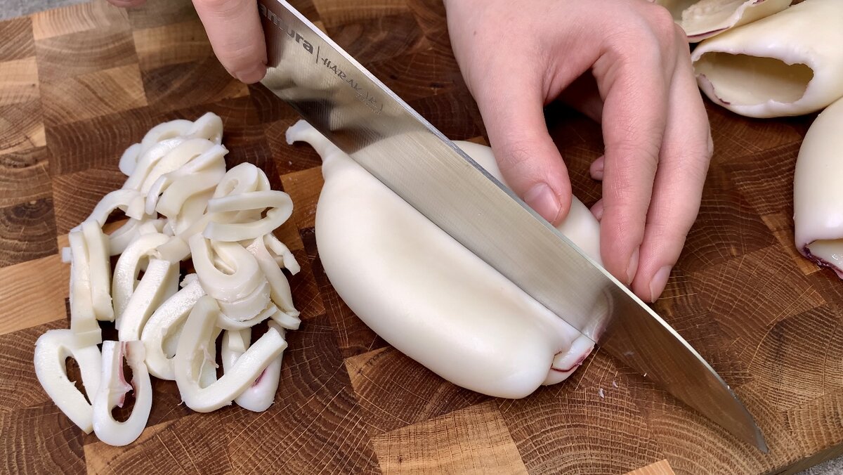 1. Кальмары отвариваем в слегка подсоленной воде, остужаем и нарезаем соломкой. Я варю кальмаров так: довожу воду до кипения, затем опускаю кальмаров, жду, когда вода снова закипит и провариваю ровно 2 минуты. 2. Шампиньоны режем кубиком и обжариваем на растительном масле до золотистости и готовности. За минуту до готовности солим, перчим и закладываем кусочек сливочного масла. 3. После жарки грибы полностью остужаем и отправляем в сал