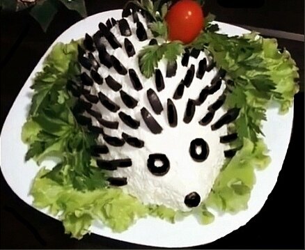 Этот салат отлично подойдёт для новогоднего стола и на день рождения. Оригинальное оформление в виде ёжика понравится и детям, и взрослым. Что нам понадобится для салата: Для обмазки верха салата: Для украшения: Отделяем белки от желтков. Желтки натереть на тёрке и смешать в миске с горошком. Порезать варёную грудку и высыпать к желткам и горошку. Пропустить чеснок через пресс и добавить майонез. Хорошенько перешиваем все. Застилаем дно плоской тарелки листовым салатом и выкладываем салат в виде полуовала, формируя туловище ёжика. Натираем в миску яичные белки и сыр, измельчаем чеснок, добавляем майонез и обмазываем этой массой салат- "туловище" ежика. Для "иголок" режем маслины на восемь долек и втыкаем их в ежа. С боку можно украсить петрушкой и помидоркой черри, насадив её на зубочистку. Глаза и нос также делаем из маслин, порезанных колечками. Оставляем салат для пропитки и подаём к столу. Приятного аппетита! Если вам понравился рецепт, поддержите статью лайком и комментарием. Пон