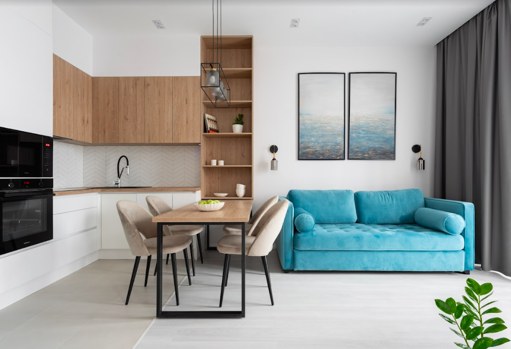 Однокомнатная квартира для молодой девушки: скандинавский минимализм в теплых тонах