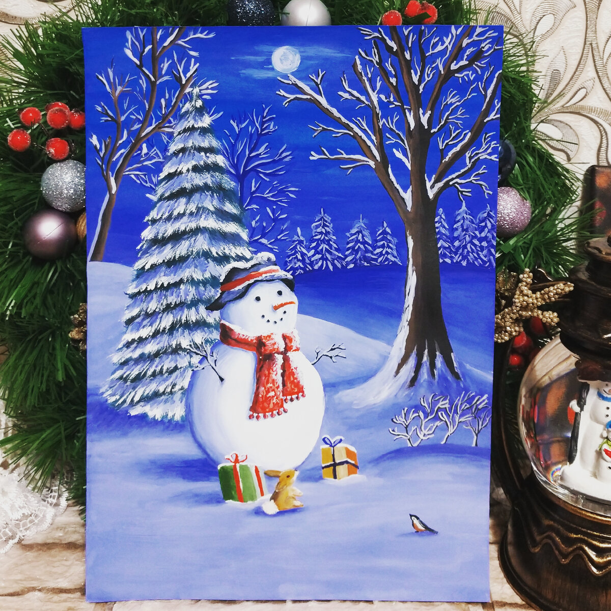 Эту картину я нарисовала в начале января 2022 года. Делала я её по видео МК, и на всю работу у меня ушло около 2-ух дней. Я думаю, что это точно новогодняя ночь, потому что снеговик получился таким, как будто он ожидает какое-то чудо и радуется. Гуашь, акварельная бумага. Январь 2022 года. #гуашь #акрил #картина #рисунок #картинамаслом #рисованиегуашью