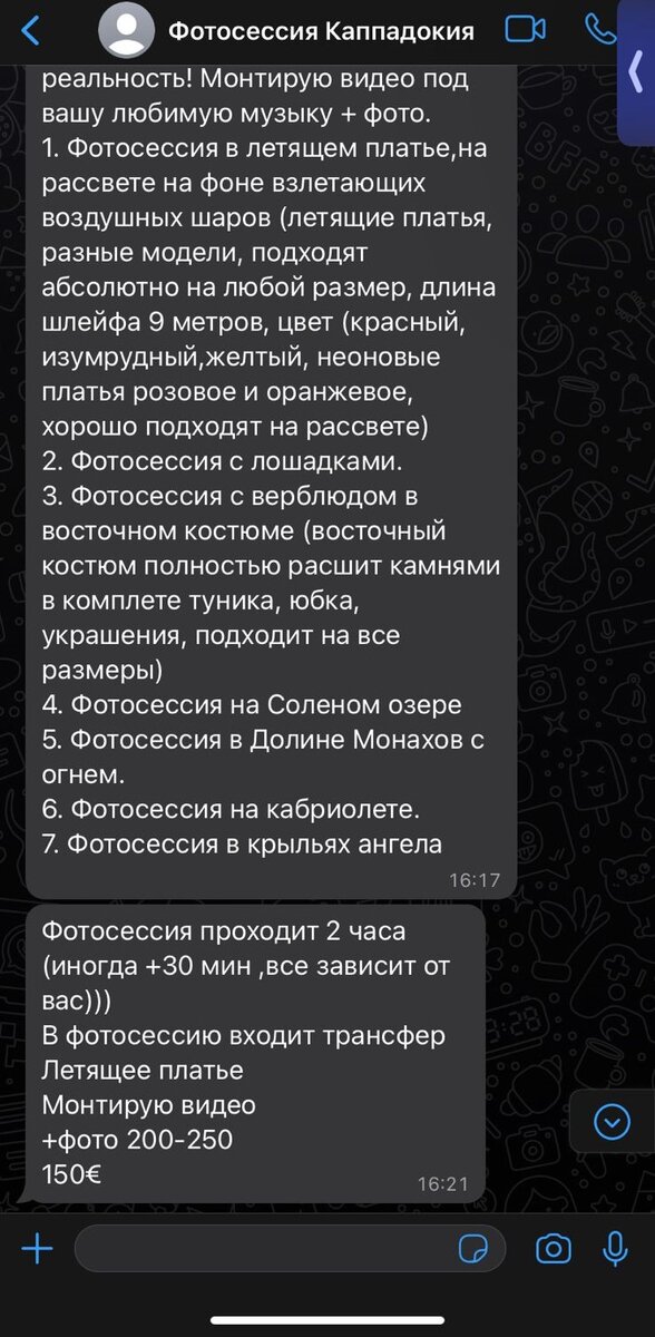 Инстаграм "фотографа" выглядел действительно хорошо. Девушка презентовала себя как фотограф и туристический гид в Каппадокии, предлагая личные экскурсии, полеты на воздушном шаре, фотосессии и много другое.