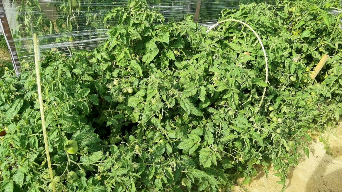 Так получилось, что в связи с устройством огорода с нуля в 2022г все культуры я сажала либо просто поздно, либо очень поздно. Кто-то уже отсажался в начале мая в теплицах, а я сажала в теплицах в самом конце мая и в первой половине июня. 7 июня у нас прокатился сильный заморозок и высаженные на уличной грядке томаты замерзли и почернели прямо по укрытием. У меня осталось немного рассады нескольких буквально сортов из выбраковки. Вот это я и воткнула в шестиметровую грядку вдоль теплицы в десятых числах июня. Чуть больше половины гряды занимали томаты, а остаток пришелся на перцы. Рассада быстренько очухалась и пошла в рост. Это два фото от 2 августа. Обе клуши заявлены как штамбовые до 40 см и не требующие подвязки. Я решила попробовать что будет если их не подвязать. Земля в любом случае у меня замульчирована травой, так что даже если кусты развалятся, то упадут не на голую землю. Кусты действительно крепенькие у Клуш, но все же получились у меня выше 40 см и под весом множества плод