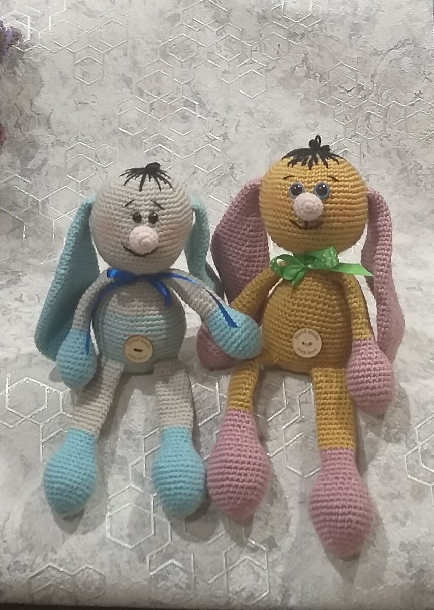 Зайчики ростом около 30 см связаны крючком из детской акриловой пряжи, наполнитель синтепух, глазки на безопасном креплении. Использован мастер класс Елены Беловой.