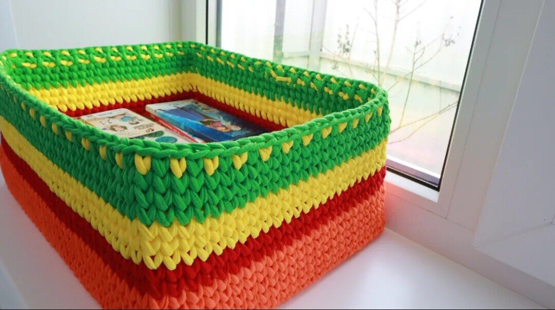 Во-первых, выше упомянутая корзина связана из трикотажной пряжи, и она априори тянется. Даже когда я её приподнимаю, чтобы протереть пыль, то сама поневоле её чуть-чуть растягиваю.