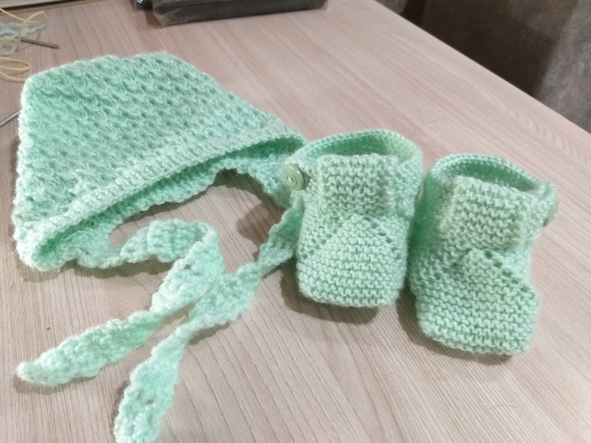 Комплект чепчик и пинетки связан из гипоаллергенной детской акриловой пряжи