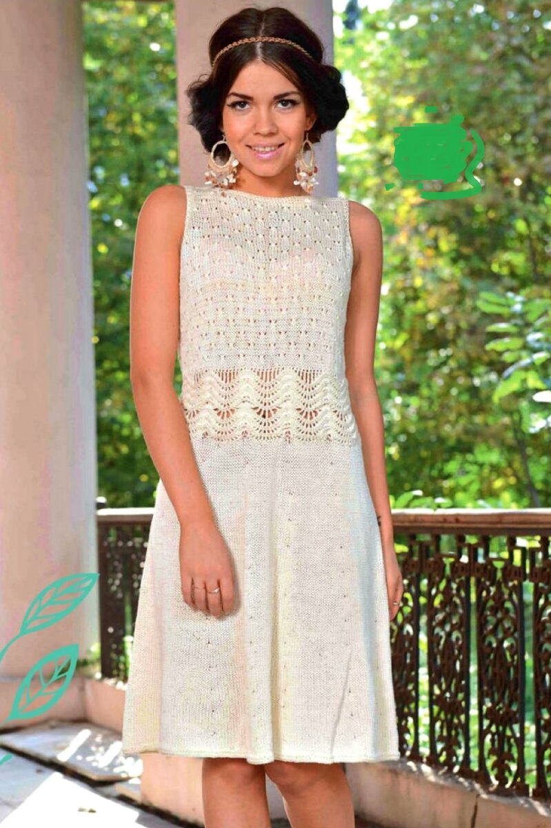 Сочетание нескольких техник вязания всегда дает потрясающе красивый эффект при создании новой вещи. Вот и эти две техники - спицы и крючок - замечательно "дружат" между собой, дополняя друг друга. Например. Вот такое несложное платье, выполненное спицами. В качестве отделки - акцент на линии талии - деталь выполненная крючком. Не забывайте листать галерею. Схема на втором листе. Следующая модель. Пуловер с ажурным узором из листьев и крючковой отделкой по низу. Крючковая кайма очень удачно подошла к узору из листьев, выполненному спицами, на пуловере. Всего лишь один небольшой элемент крючком дополнил легкостью и воздушностью эту кофточку. Такая модель частенько попадалась мне несколько сезонов подряд. Основное полотно - резинка два на два. Рукав реглан и широкий воротник - из мотивов крючком. Узор мотивов может быть использован любой. Смотреться красиво будут и розочки, и менее пышные узоры. Еще одно платье. На этот раз кокетка выполнена простыми столбиками крючком и обвязана рачь