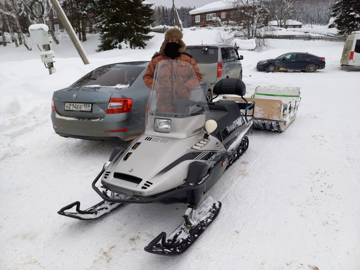Но вот где-то вдалеке затарахтел движок, и я увидела приближающийся от другого берега свет одинокой фары. Снегоход! За рулём оказался колоритный мужичок в добротной дублёнке и пушистой шапке-ушанке. Вот они, наше транспортное средство и водитель (фото сделано в конце пути):