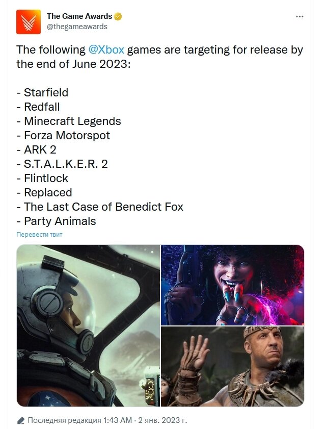 На официальной странице The Game Awards в Twitter (запрещена в РФ) был опубликован список крупных игр, которые выйдут к июлю 2023 года. Всего указано 10 продуктов, среди которых можно встретить и такие, чьи даты релиза до сих пор официально не указаны. В частности, стоит обратить внимание на шутер S.T.A.L.K.E.R. 2 — на странице игры в Steam до сих пор указан декабрь 2023 года. А вот на официальном сайте Bethesda был обновлен раздел с FAQ космической ролевой игры Starfield. И там теперь указано, что продукт появится на рынке в первой половине 2023 года, что совпадает с опубликованными данными.
