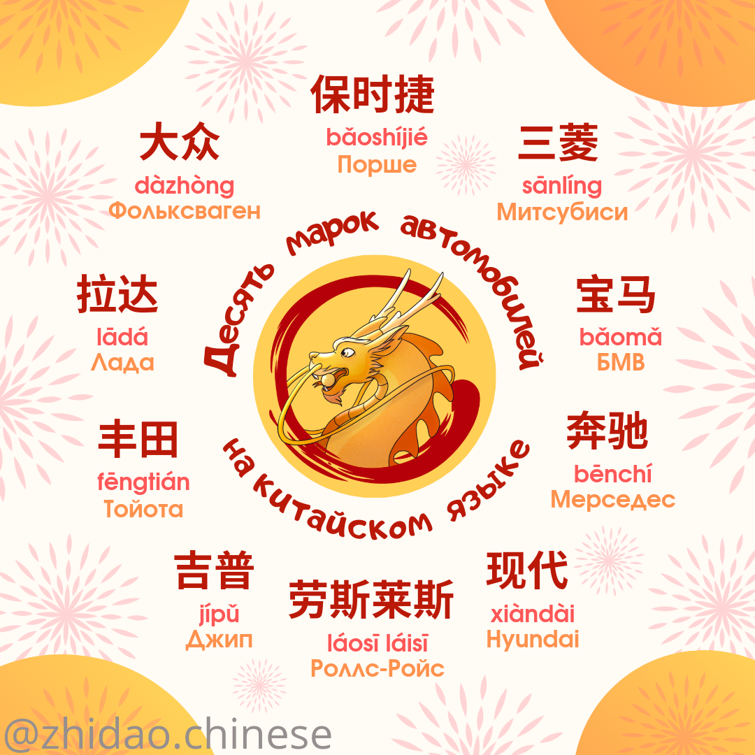 #zhidao_способы_сказать💭 Сегодня делимся с вами десятью марками автомобилей на китайском языке! 🚗 1️⃣ 保时捷 bǎoshíjié Порше 2️⃣ 三菱 sānlíng Митсубиси 3️⃣ 宝马 bǎomǎ БМВ 4️⃣ 奔驰 bēnchí Мерседес 5️⃣ 现代 xiàndài Hyundai, Хёндэ 6️⃣ 劳斯莱斯 láosī láisī Роллс-Ройс 7️⃣ 吉普 jípǔ Джип 8️⃣ 丰田 fēngtián Тойота 9️⃣ 拉达 lādá Лада 🔟 大众 dàzhòng Фольксваген 📝 Ссылка на карточки Quizlet для изучения новых слов: https://quizlet.com/_ckpg5p?x=1qqt&i=2r5snr ❗В Quizlet вы можете послушать произношение всех фраз! Для этого нажмите на значок микрофона 🔊 📚 Хотите, чтобы Вы или Ваш ребенок заговорили на китайском? Напишите нам для записи на групповые / индивидуальные занятия! 🎓 #china #chinese #школакитайского #китайский #москва #язык #китайскиймосква #учукитайский